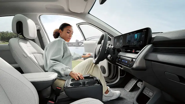 O interior do Hyundai IONIQ 5 une flexibilidade e performance com espaço para tudo e para todos. A nova plataforma EV permitiu criar uma experiência 100% nova dentro do IONIQ 5. Um piso maior e uma consola central flexível que pode ser movida pelo habitáculo. Uma experiência extraordinária.