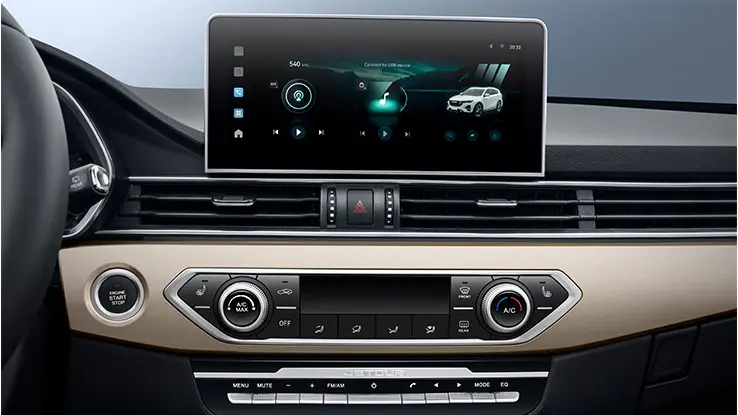 O equipamento premium do X70 torna o seu interior mais convidativo. Desfrute do ecrã de 10,25” com conexão ao smartphone, por USB ou por Bluetooth.