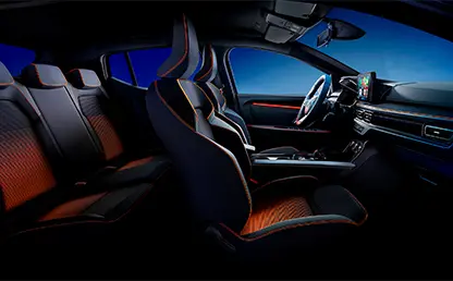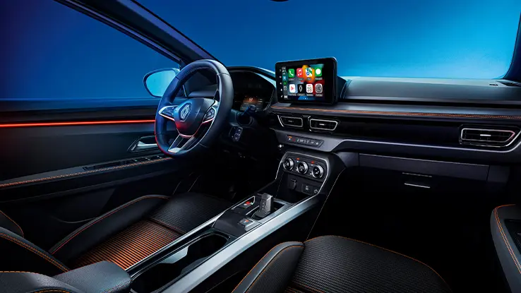 O Renault Kardian surpreende com um habitáculo moderno, espaçoso e funcional. Os bancos ergonómicos com pespontos em laranja* e o emblema Renault nos estofos conferem um toque distinto de elegância e identidade à marca. A consola central elevada garante um acesso cómodo ao e-shifter da caixa automática* e inclui um prático apoio de braço com 8 litros de capacidade, ideal para arrumação no dia a dia. A bordo, tudo está pensado para o seu conforto, da posição de condução à qualidade dos materiais.