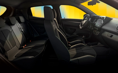 O Renault Kwid oferece um interior surpreendentemente espaçoso e funcional para um modelo compacto. Os estofos em tecido garantem conforto no dia a dia, enquanto o ar condicionado assegura o bem-estar de todos os ocupantes. Os vidros elétricos aumentam a conveniência, e os apoios de cabeça nos bancos traseiros contribuem para uma viagem mais segura e confortável para todos. Tudo isto num habitáculo prático, pensado para tornar cada viagem mais agradável.